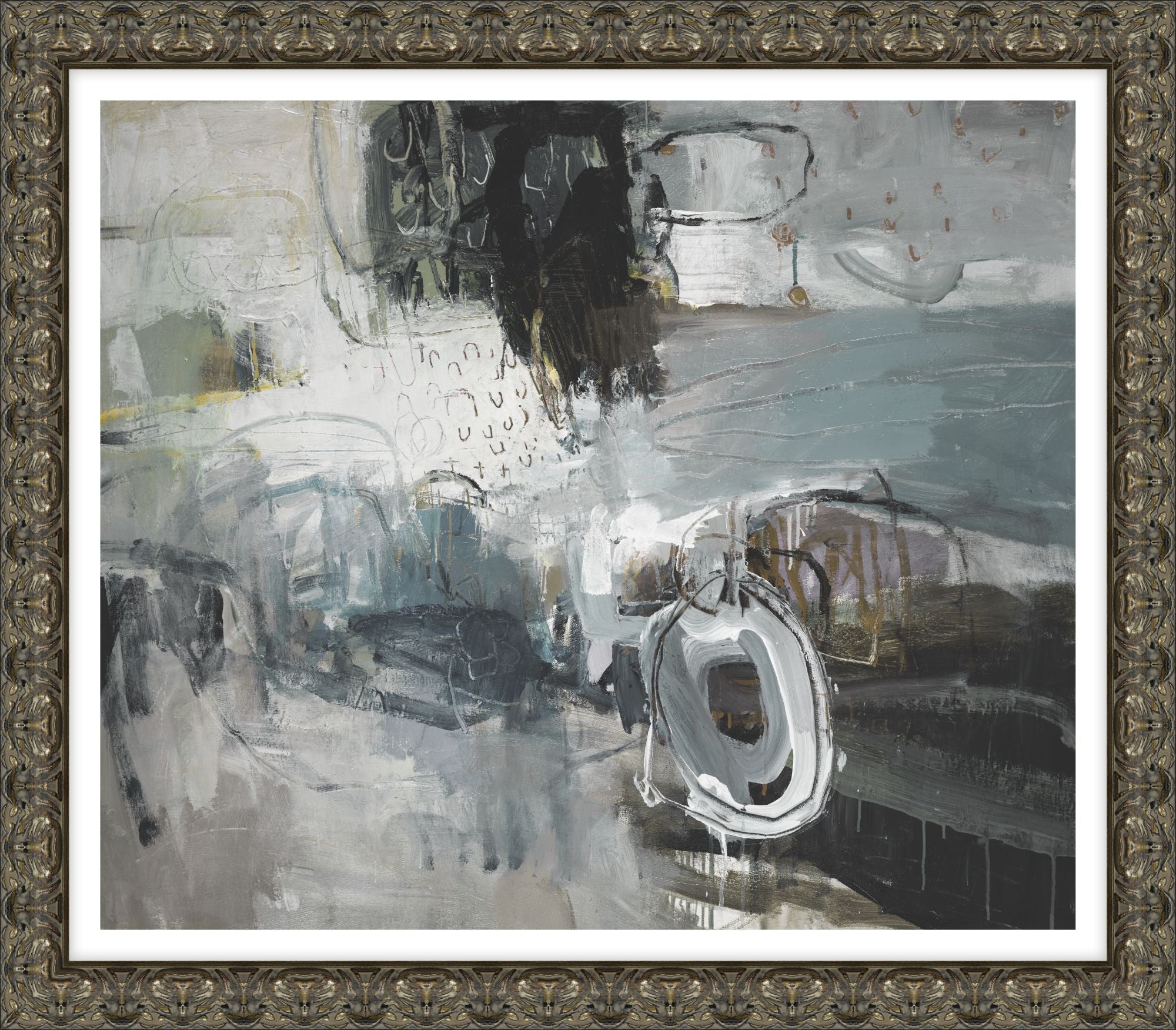 Detail: Canvas - Framed | Hand Embellished Semi Gloss | F1353 - Antique Silver Cap Frame - Width: 2.75 | F1354 - Natural Linen Liner - Width: 1.25